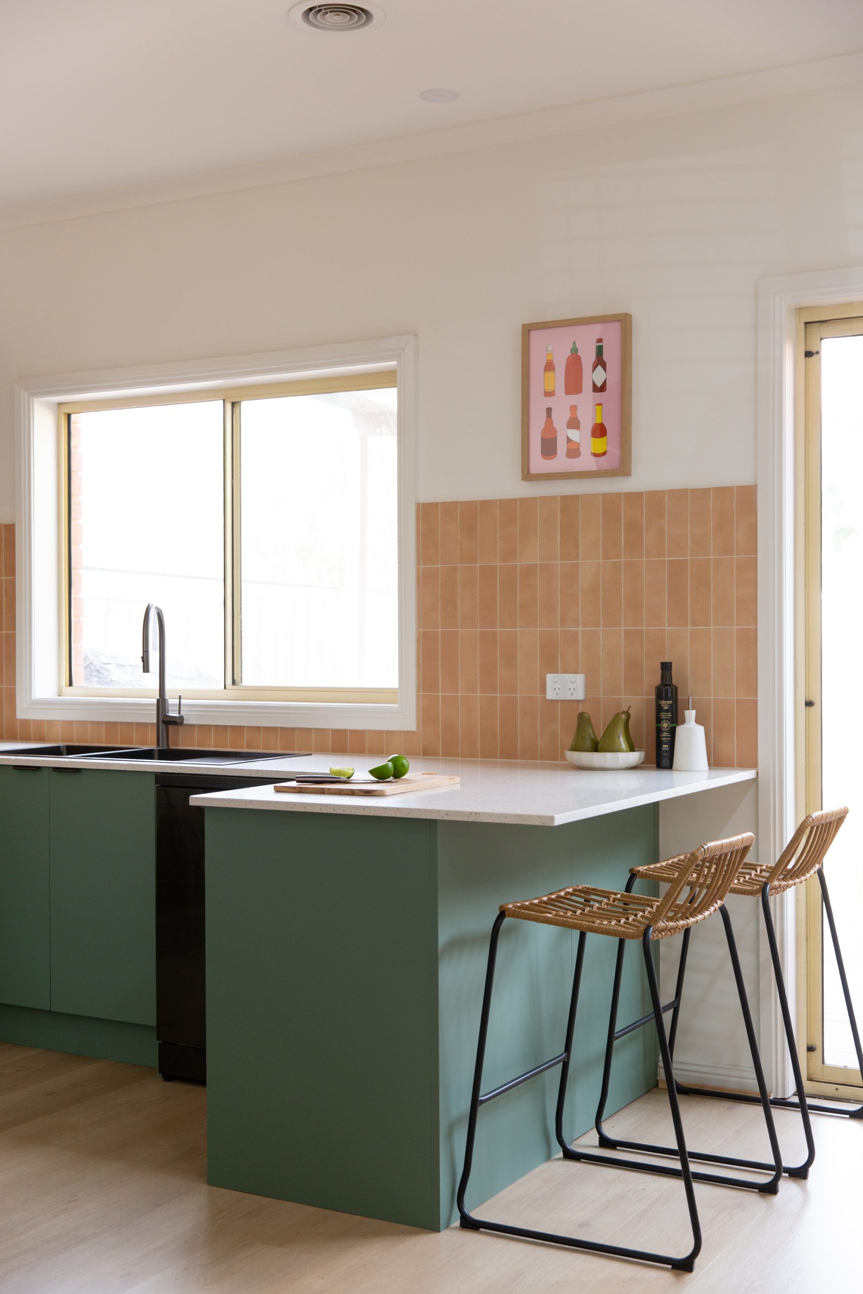 The choice of Green cabinetry created the bold colour personality the client was seeking. The additional warmth of the overhead oak cabinetry blends seamlessly with the flooring and tiled splashback.