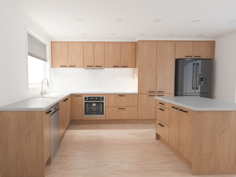 L Shaped kitchen in oak timber laminate with laminate benchtop