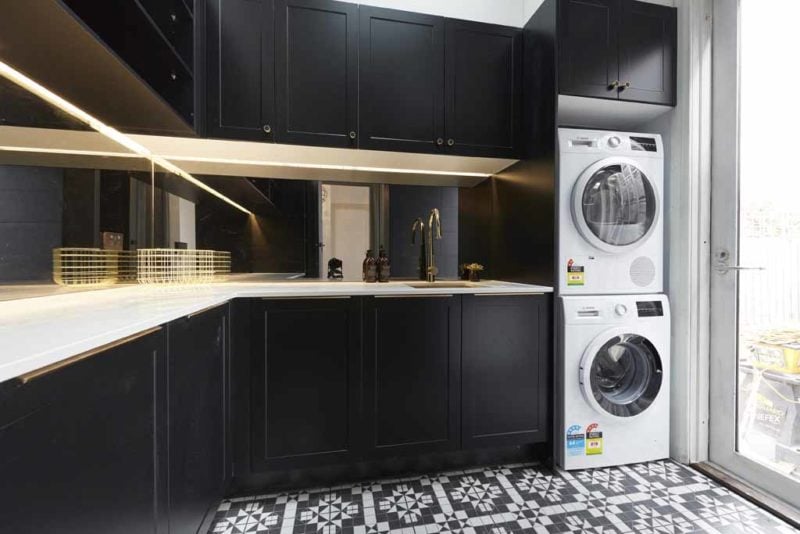 The extravagance of the smoked mirror splashback and the stunning floor tiles created the uniqueness here. The brass tap, sink and accessories made the laundry space feel like royalty – certainly extravagant for a laundry space although they were not working to a budget like most of us are!