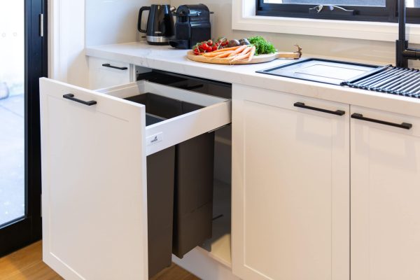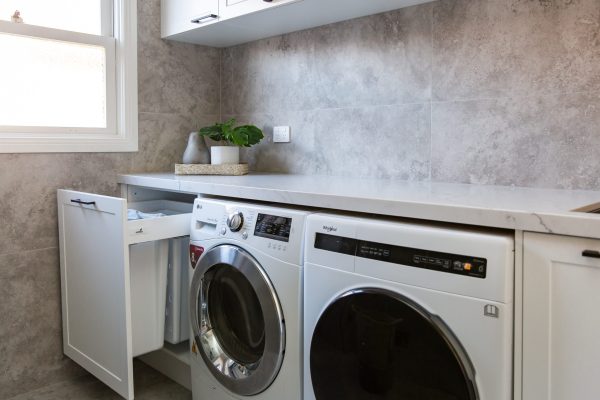 The laundry features a long benchtop with under mount sink and a side-by-side washer and dryer. To keep the laundry organised, large pull-out baskets were added beside the washing machine…avoiding the dreaded mountain of dirty laundry!