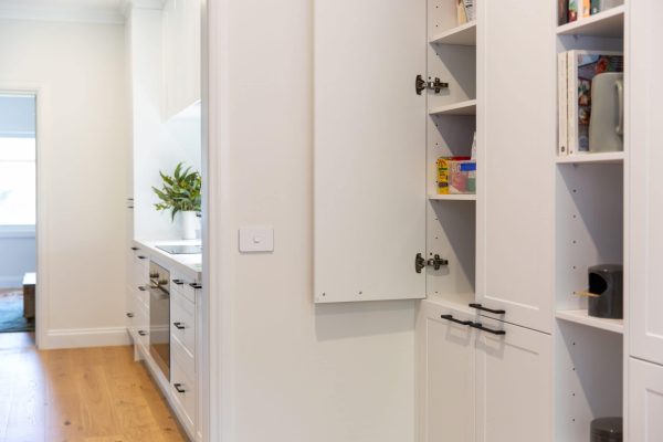 Tucked behind a sliding door lies a fully functional Butler’s Pantry which acts as a second kitchen space. Ample storage, benchtops and appliances like the fridge frees up space in the adjacent kitchen.