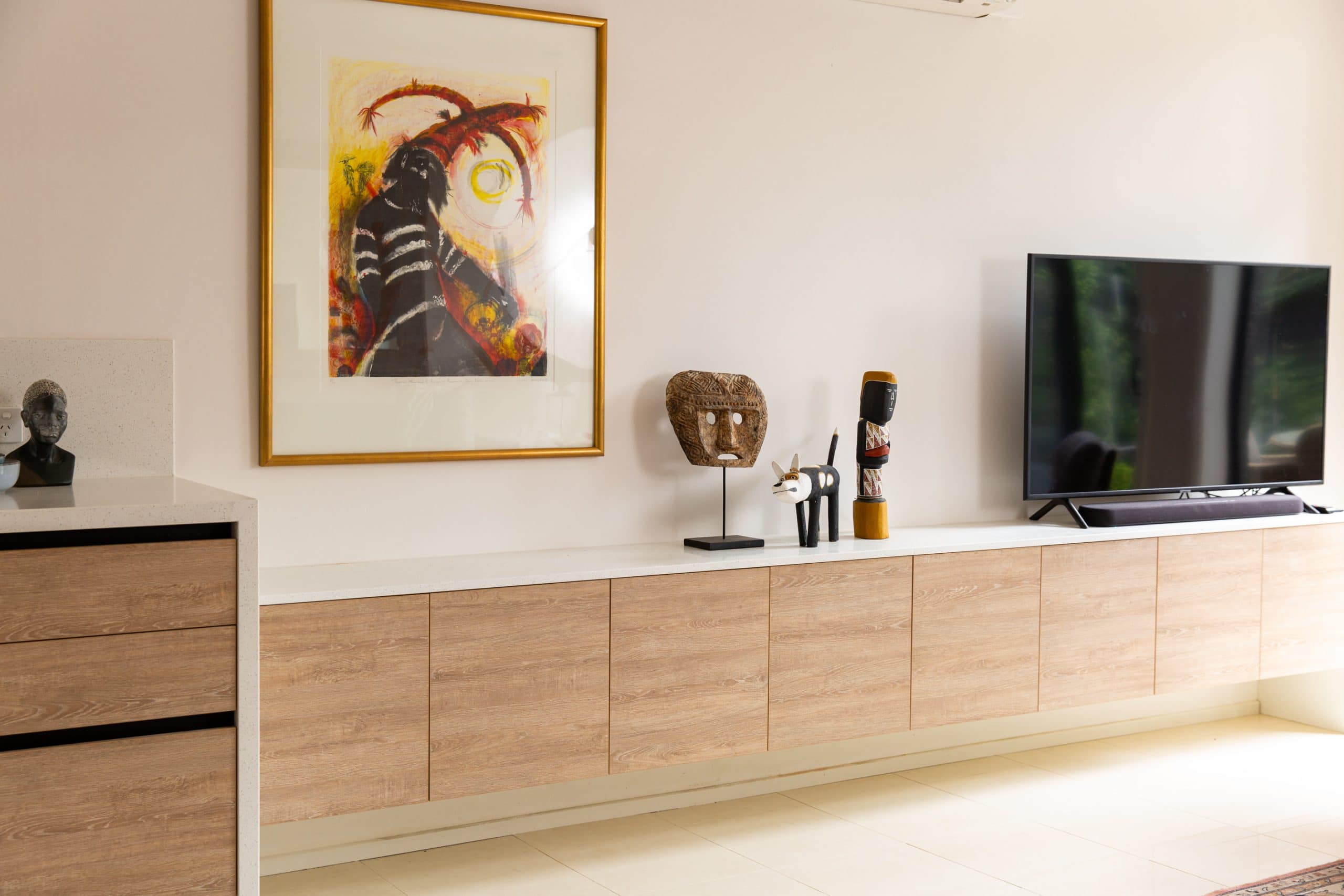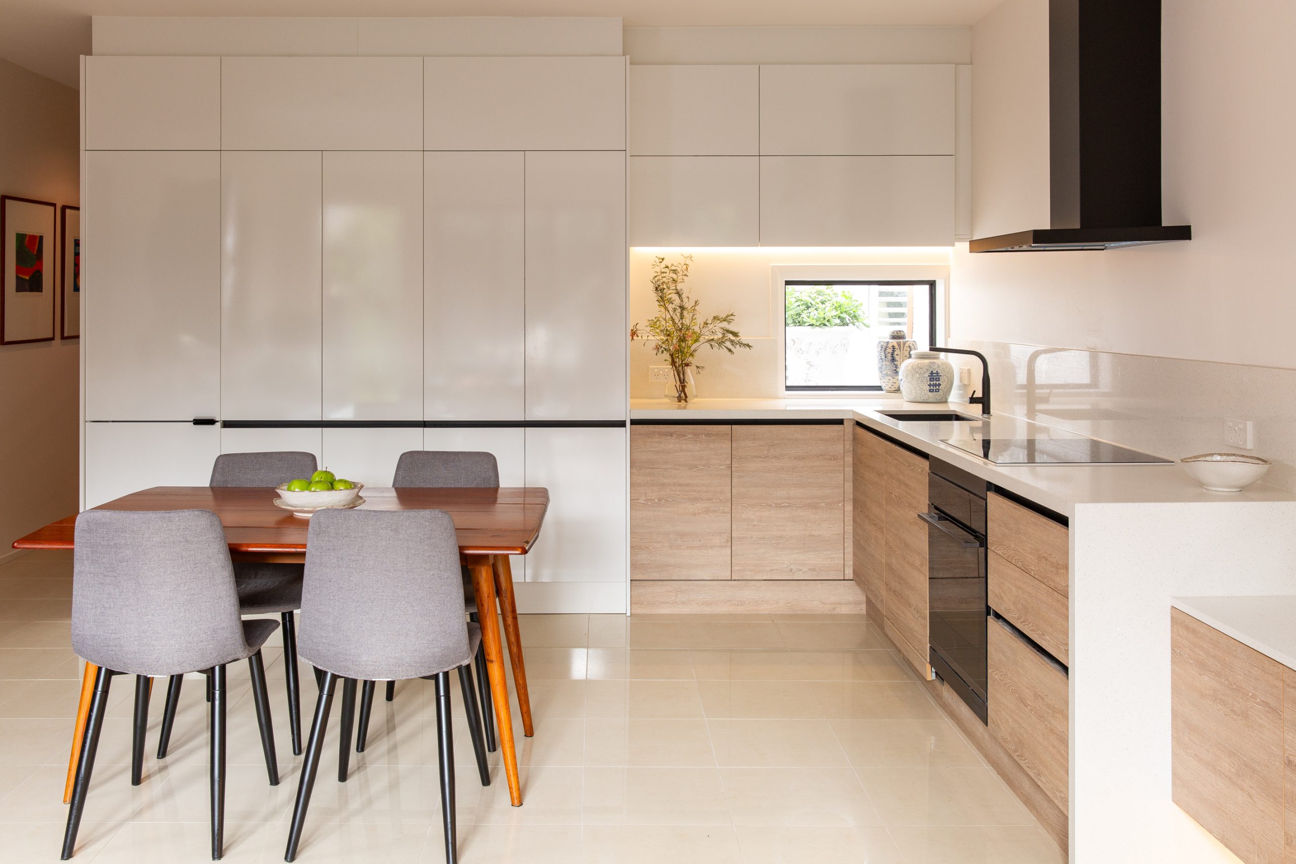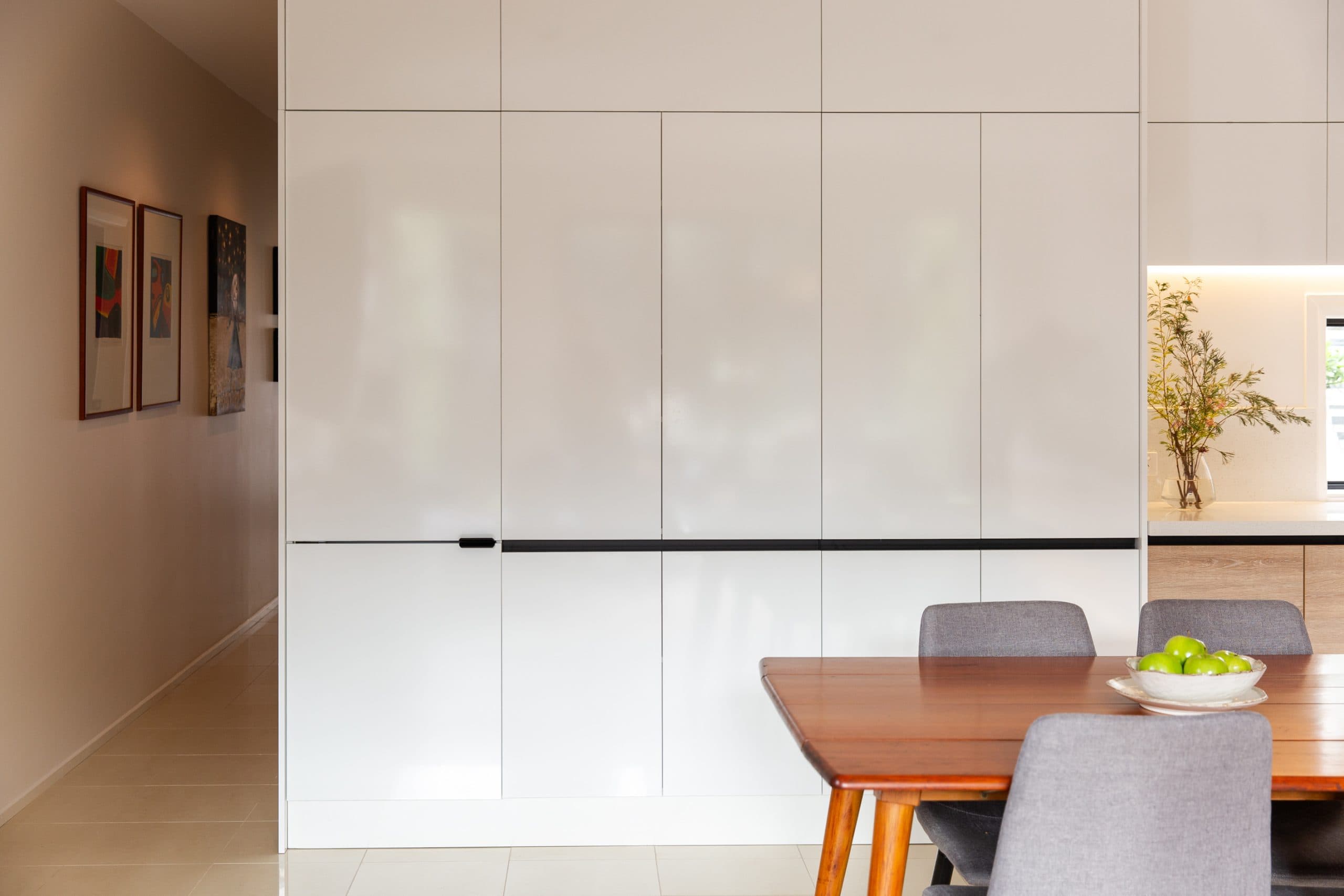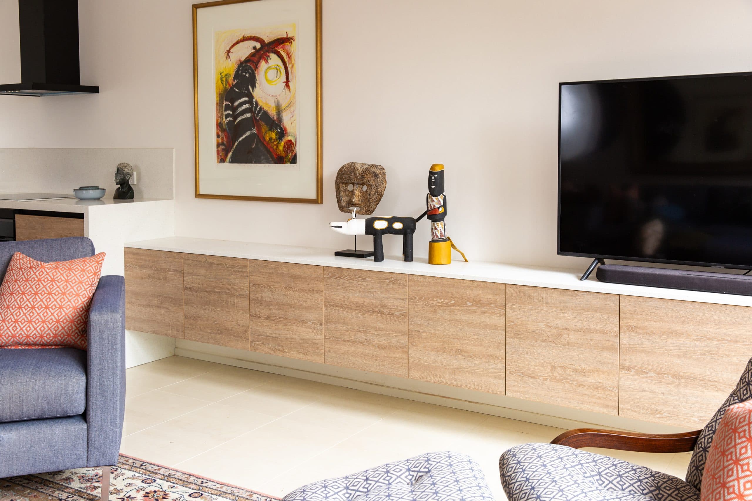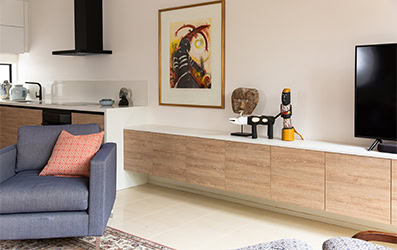 Gareth has created a wonderful sense of cohesion with the kitchen and living room, through his clever use of kitchen cabinetry and selection of stone benchtop. Using Platinum Inspire Snowdrift sheen streamline cabinetry, the kitchen literally flows into the living room, creating a beautiful light-filled space. The final renovation photos display the flowing, open living space that the owner dreamed of.