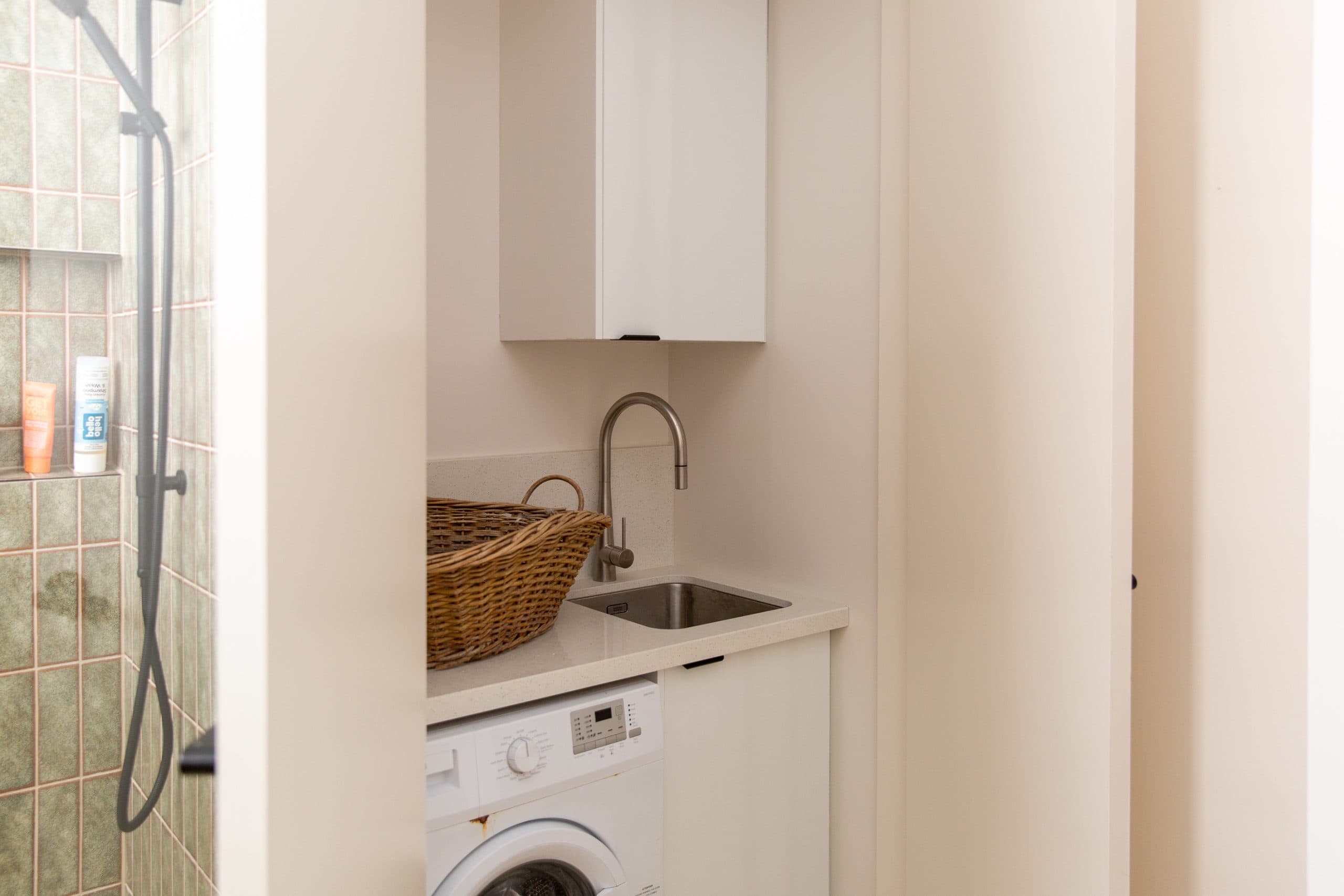 The owner also did a laundry with Kitchen Shack that is now highly functional where a basket can sit on the benchtop behind closed doors, keeping mess hidden from sight.