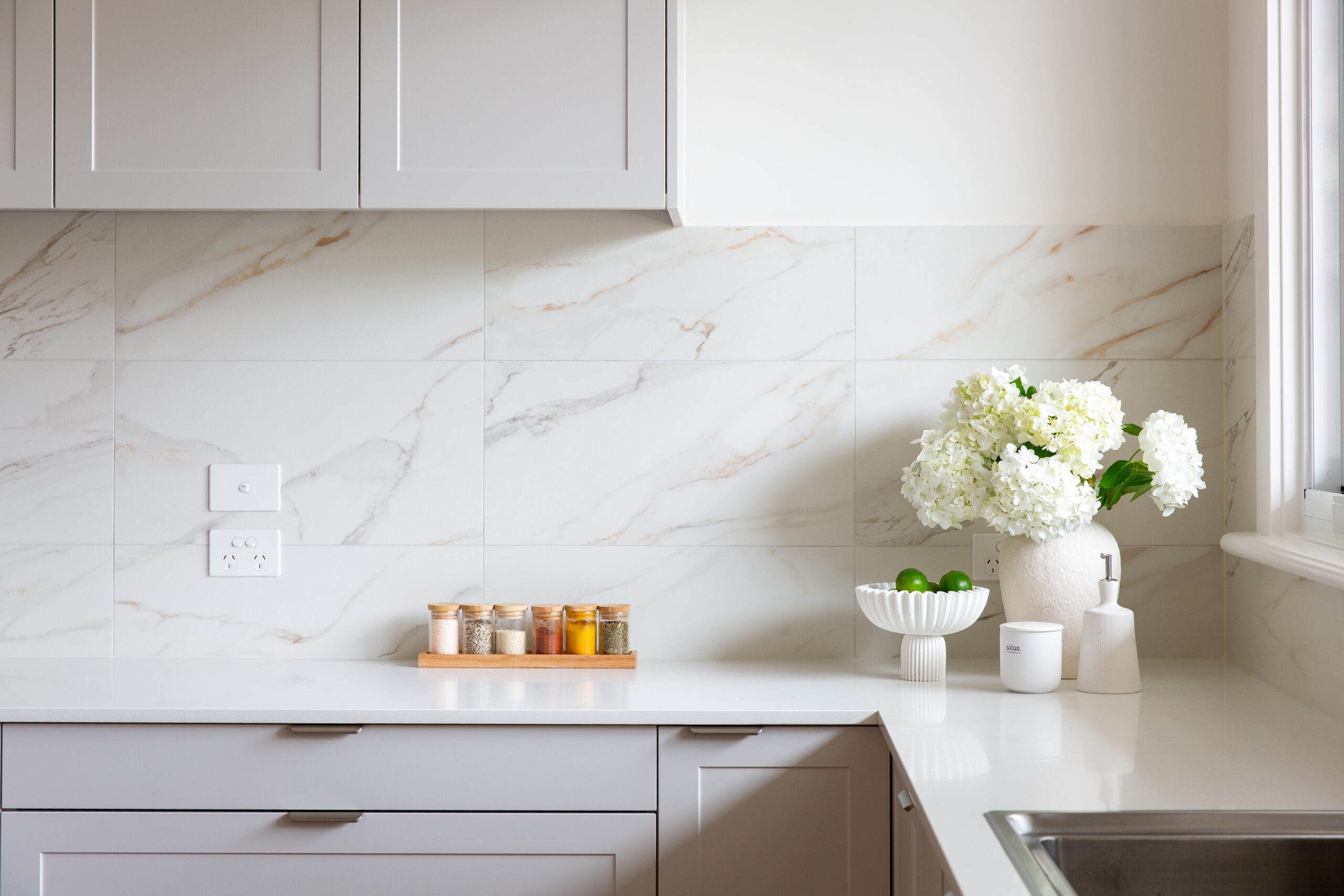 The newly designed open plan kitchen features a beautiful Island bench in YDL Deluxe Rosemee stone. The Rosemee has a soft cream base with subtle touches of light grey that beautifully complement the style and colours of cabinetry selected.
