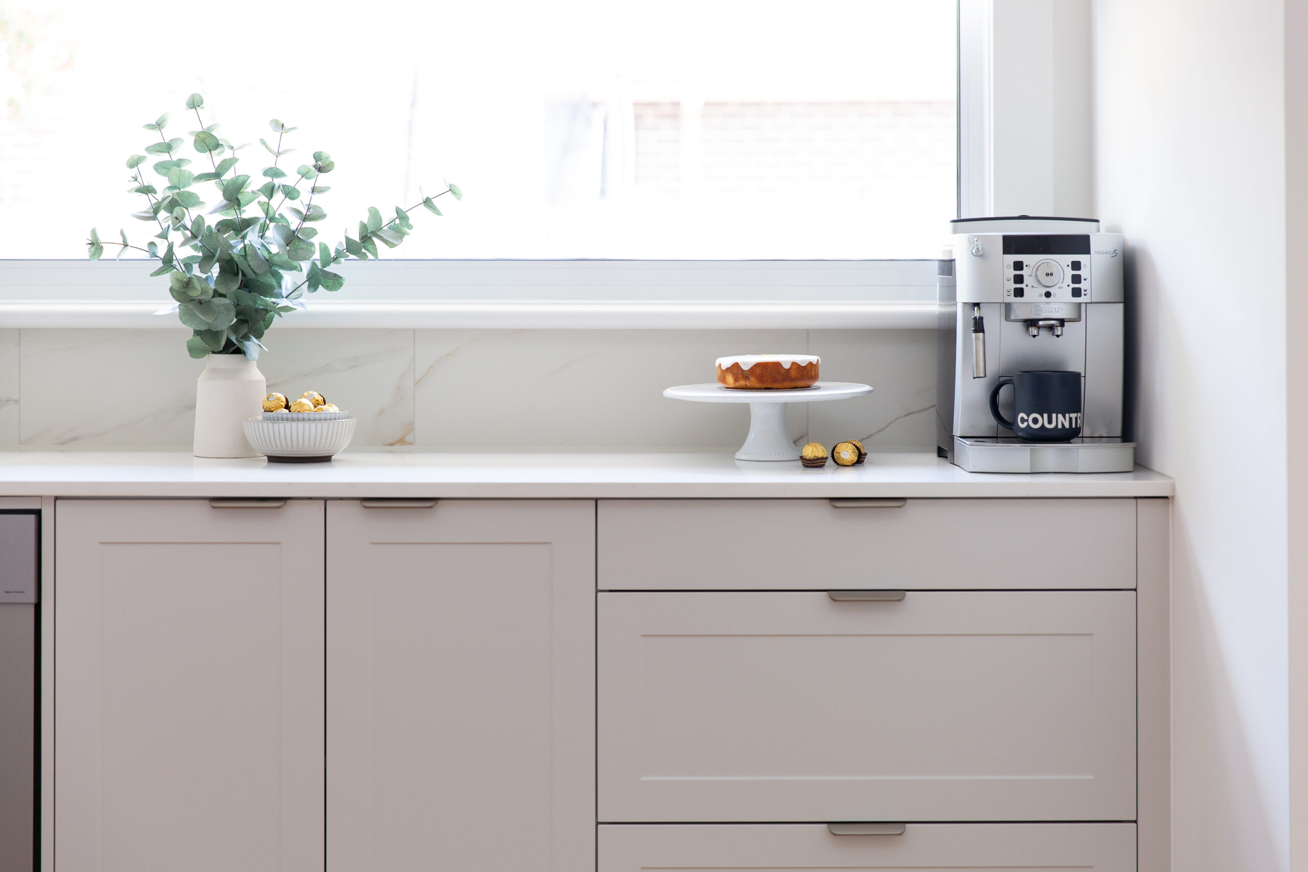 New kitchen cabinetry is designed in popular Shaker Aries Satin creating an airy, light-filled feel. In warm contrast, Mary has detailed Excel Urban Oak cabinetry beneath the Island bench.