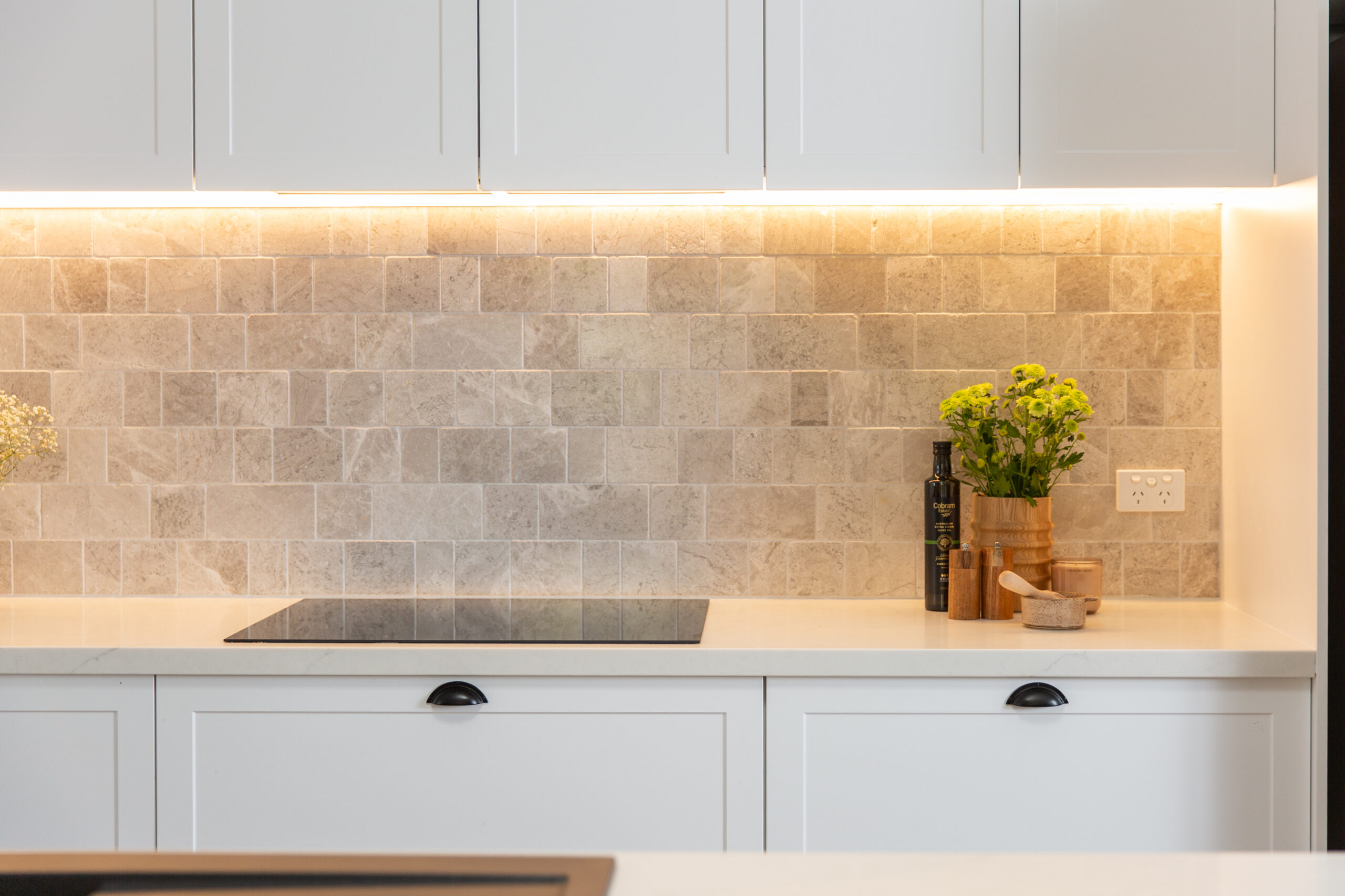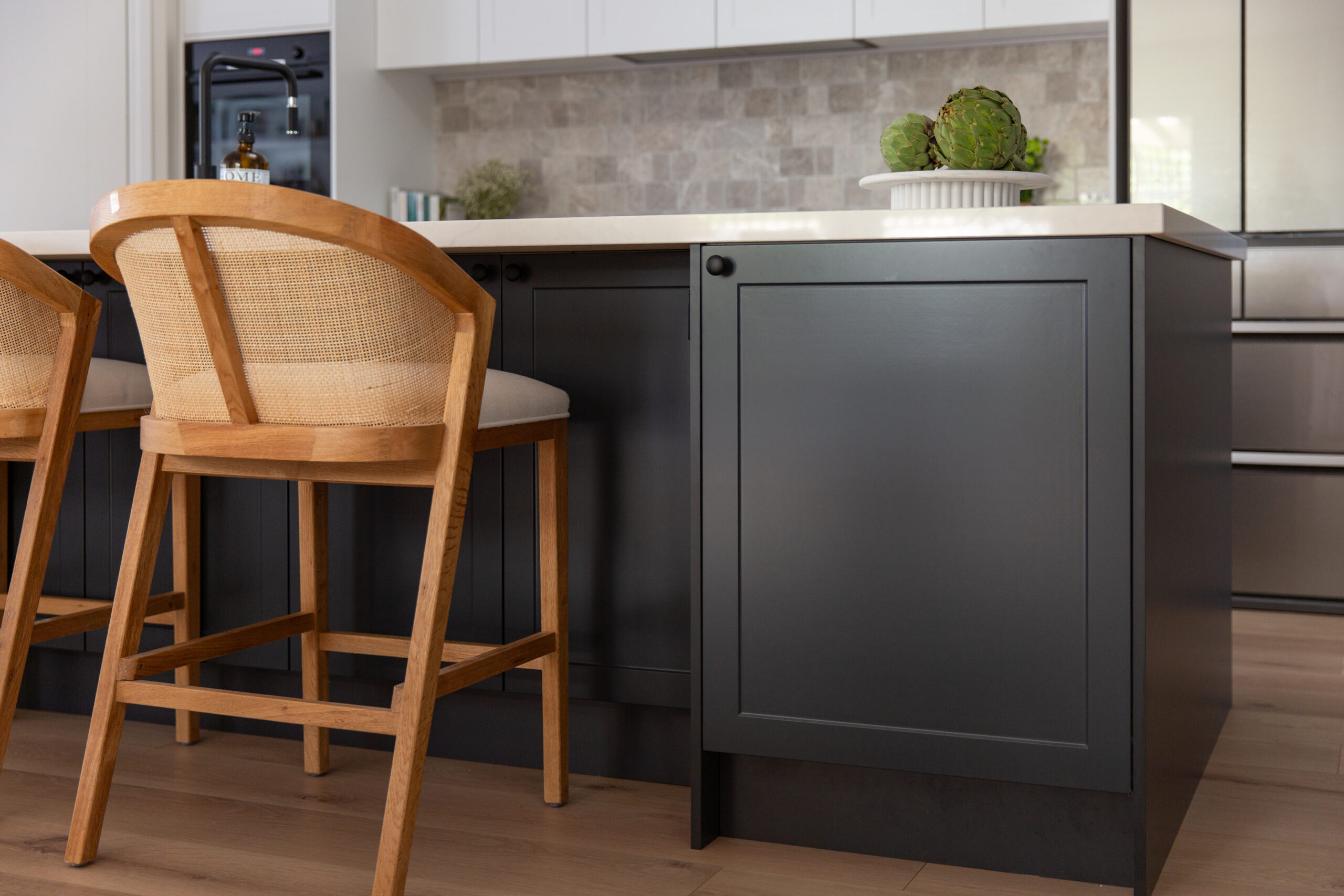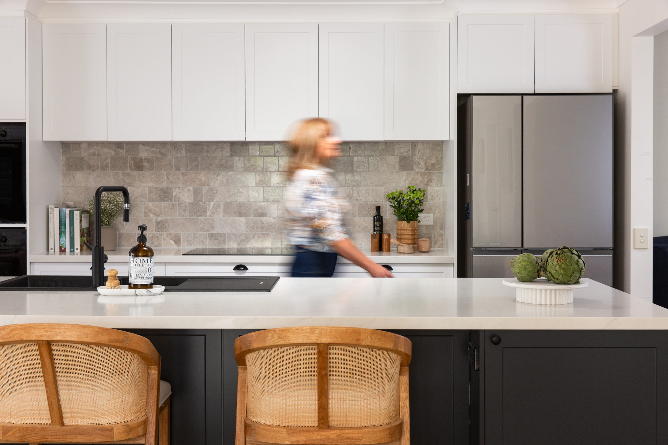 The long streamlined design featuring Shaker White and Terril colour cabinetry at the front of the island bench perfectly complements each other and suits the family’s interior design.