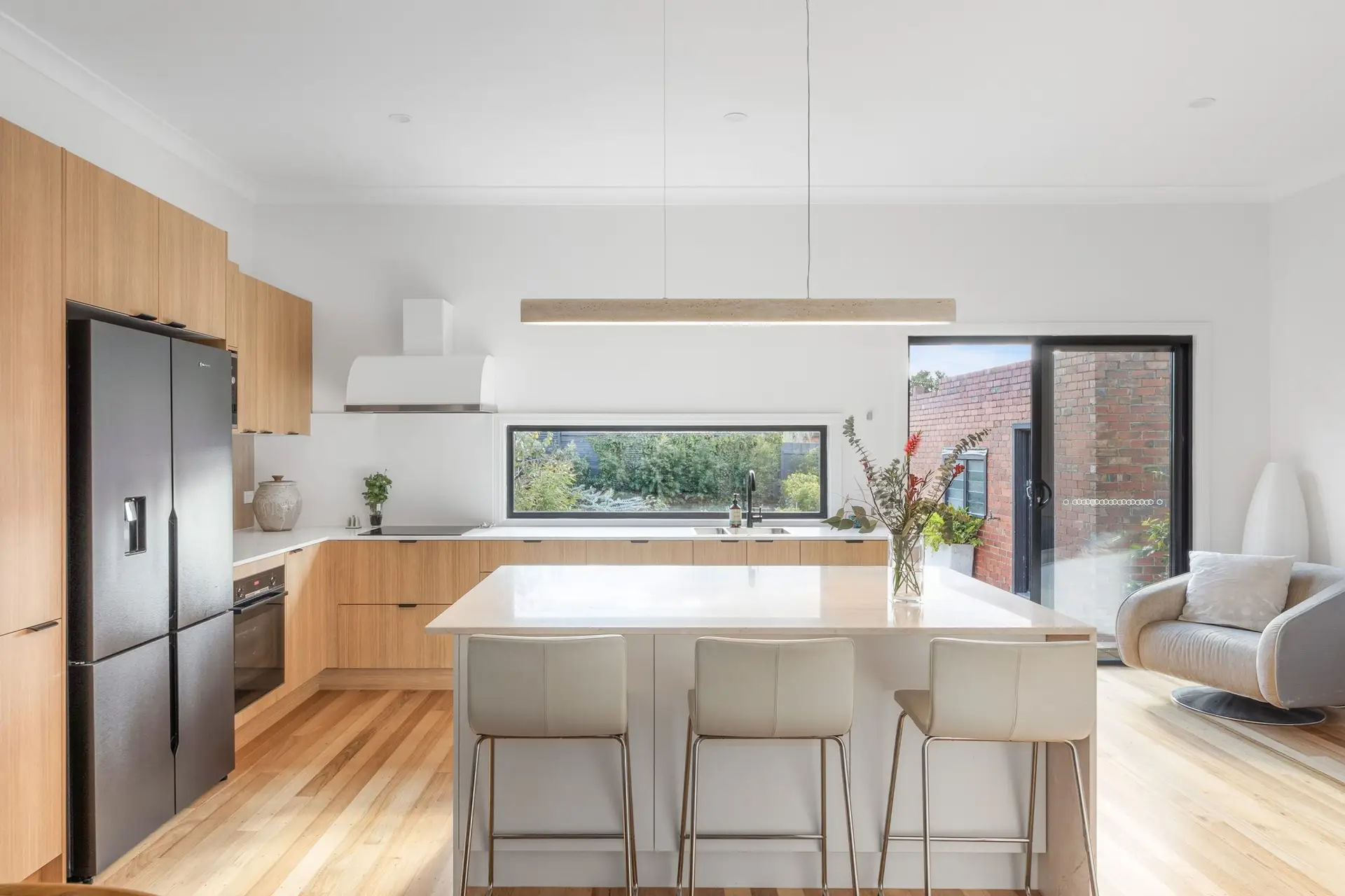 A large feature window behind the sink allows natural light to flood into the kitchen and offers views of the lush back garden, creating a calm and inviting space for cooking and gathering.